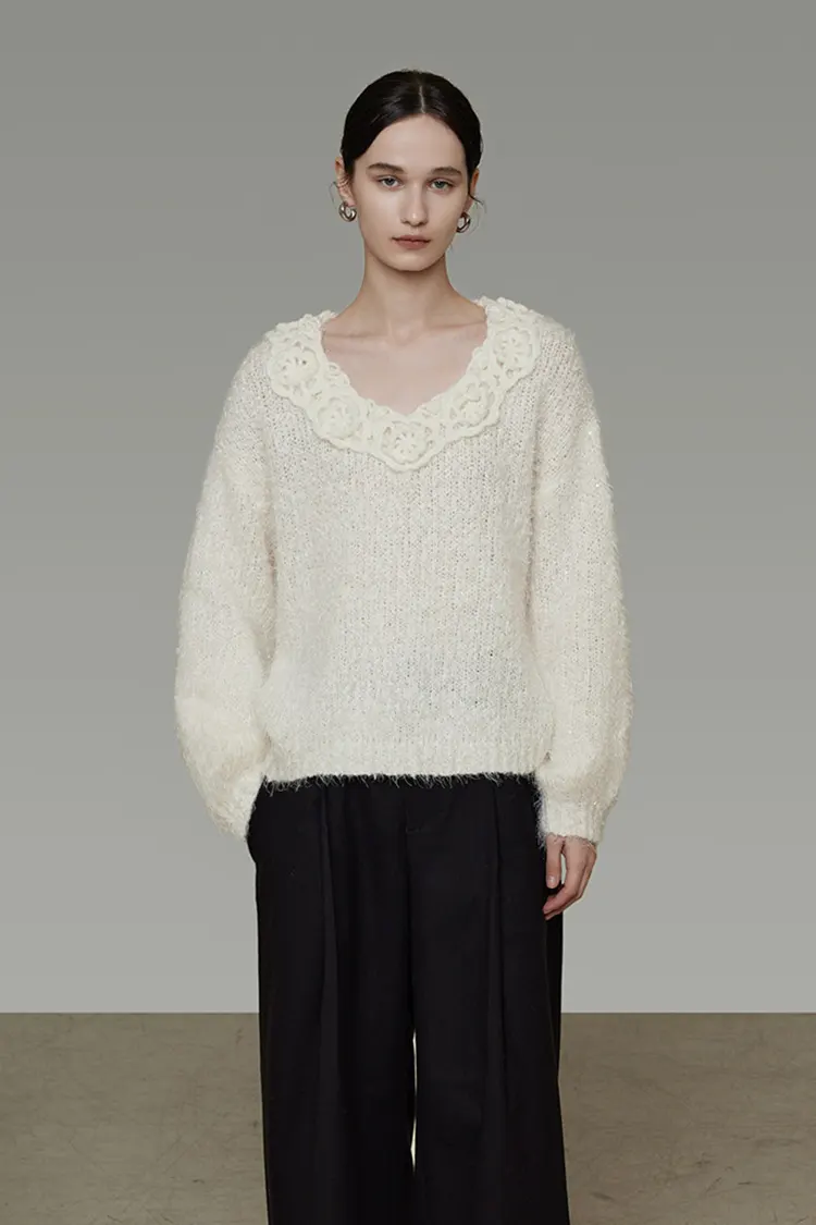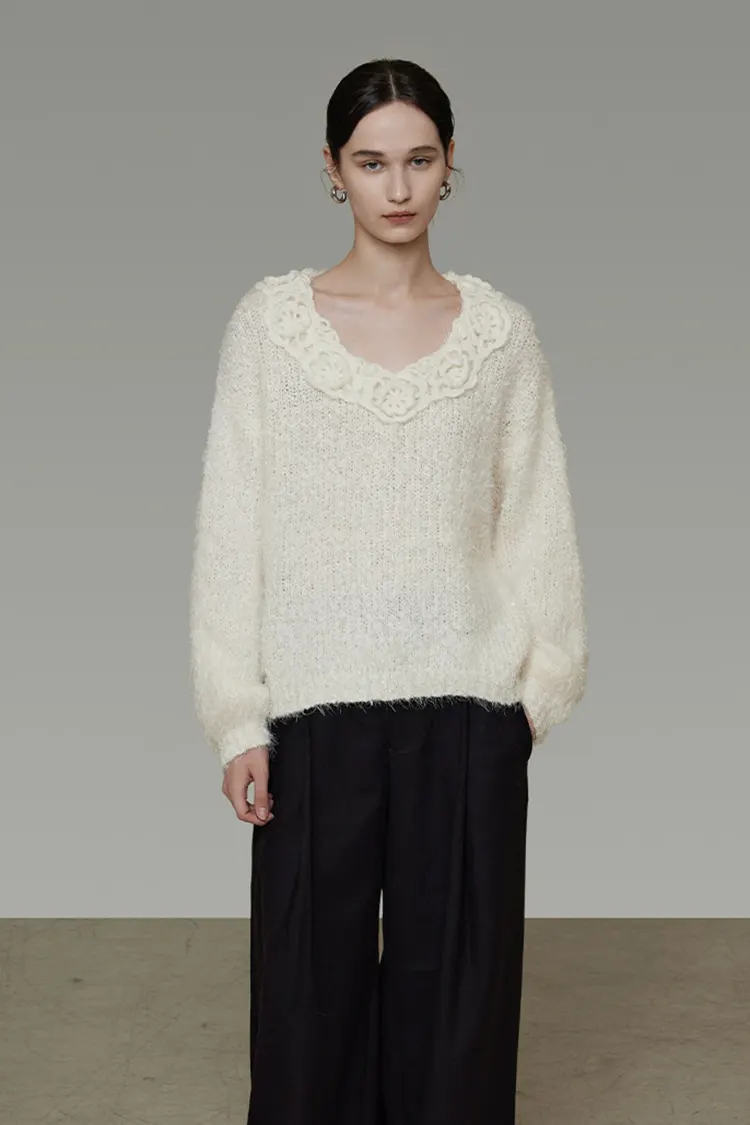 Sweater Renda 3D Wanita menampilkan reka bentuk leher V yang dalam. Bahagian tepi garis leher dihiasi dengan renda kerawang bersulam indah, dilengkapi dengan butang fabrik kecil dari fabrik yang sama. Ketukangan renda tiga dimensi jelas berlapis, dengan perincian yang halus dan lembut. Penampilan keseluruhannya manis, romantis, namun elegan. Sama ada dilihat dari hadapan atau belakang, ia mempunyai deria reka bentuk yang kukuh, membolehkan baju sejuk warna pepejal asas melepaskan diri daripada monotoni dan meningkatkan kecanggihan pakaian dengan mudah. Ia sangat sesuai untuk pengguna yang mementingkan perincian dan tekstur.